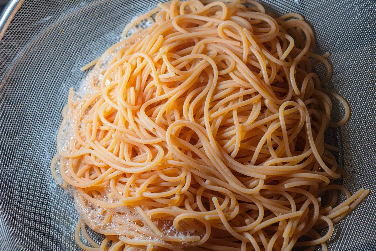Отварите спагетти аль денте в кипящей подсоленной воде. Пока спагетти варятся, смешайте оливковое масло с лимонным соком и солью.