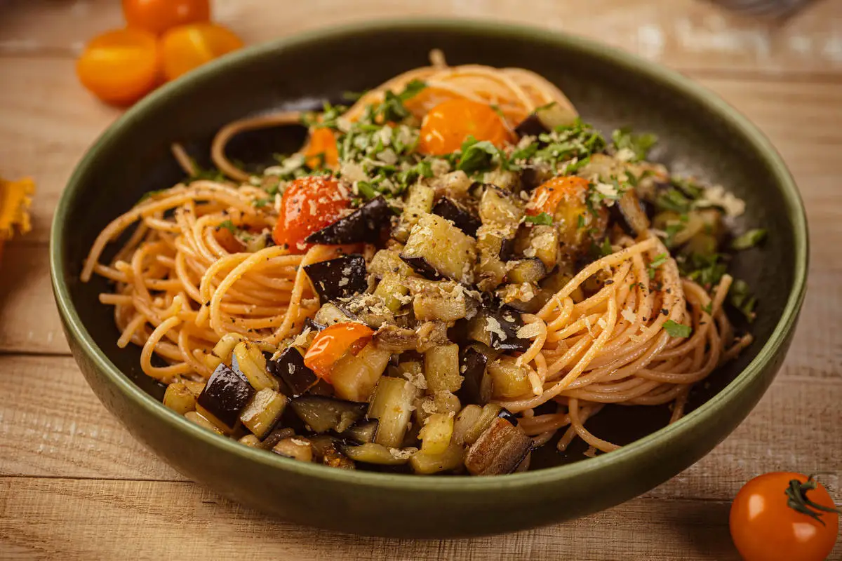 Спагетти из чечевицы с баклажанами