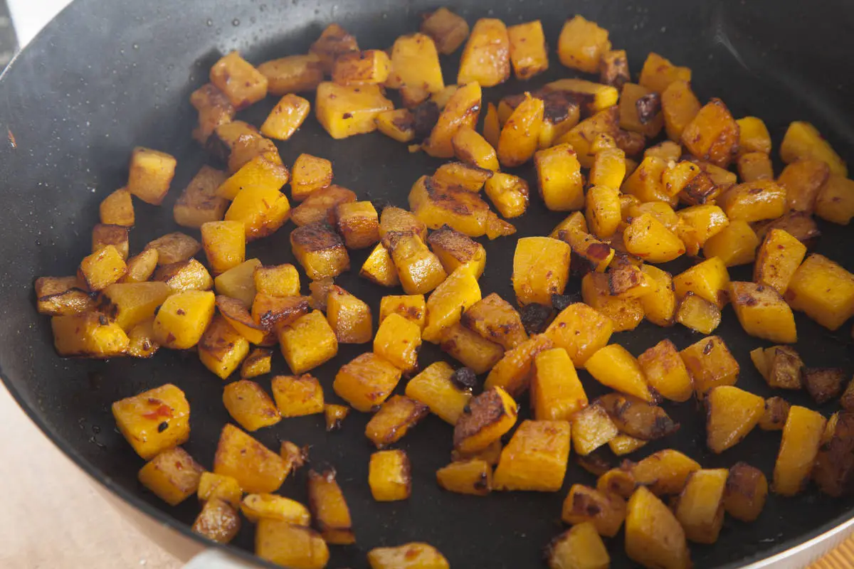 Поставьте кипятиться воду для пасты. Тыкву очистите и порежьте кубиками, обжарьте на оливковом масле до золотистости, посолите, добавьте кайенский перец, убавьте огонь и накройте крышкой.