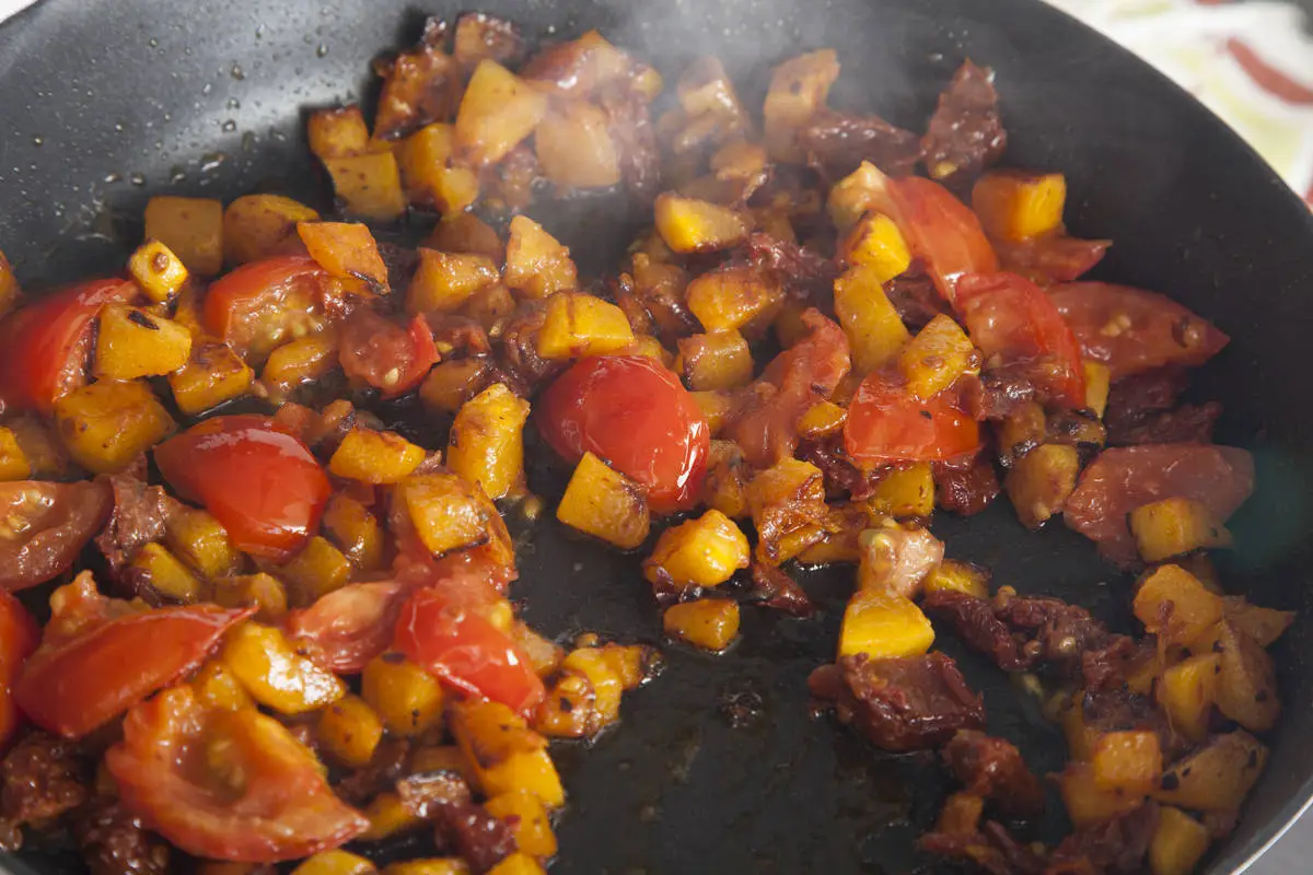 Вяленые томаты отряхните от лишнего масла, мелко порежьте, помидоры черри порежьте половинками, добавьте все к тыкве и обжарьте на среднем огне.