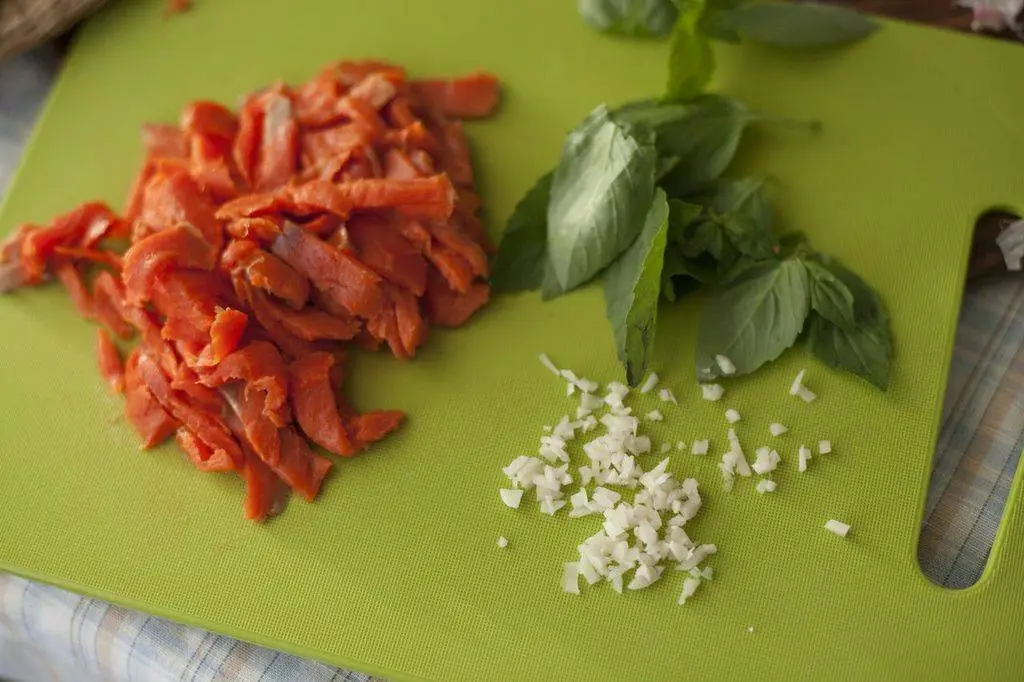 Нерку нарежьте полосками, порубите чеснок и базилик.
