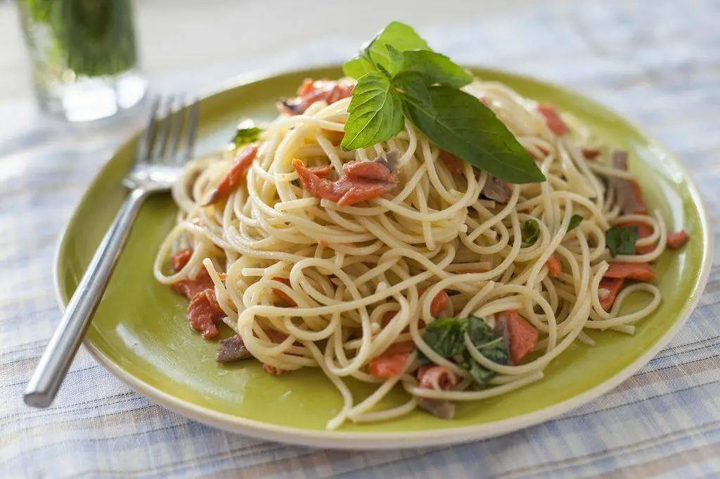 С готовых спагетти слейте воду, налейте оливковое масло (не жалейте, здесь он — основа соуса) и добавьте кусочки нерки и чеснок, перемешайте и подавайте! В тарелку добавьте базилик, поперчите — ешьте пасту горячей!