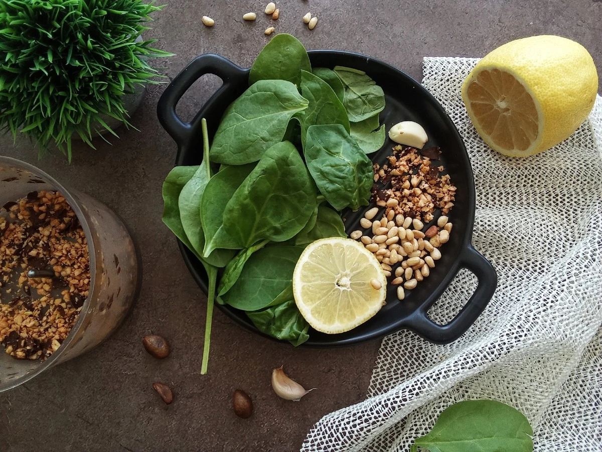 Шпинат тщательно промойте, припустите на сковороде. Когда лишняя жидкость выпарится, добавьте немного оливкового масла, измельчённых орехов мушмулы, кедра, лимонного сока и соли. Потушите в течение 5 минут.