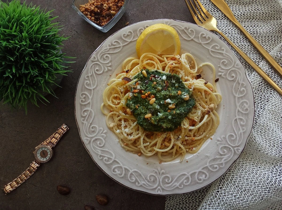 Спагетти с соусом из шпината, ядрами кедра и мушмулы