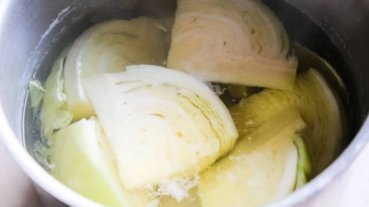 Капусту нарежьте сегментами, сохраняя кочерыжку, и бланшируйте в кипящей воде 10 минут. Откиньте на дуршлаг, чтобы стекла лишняя жидкость.