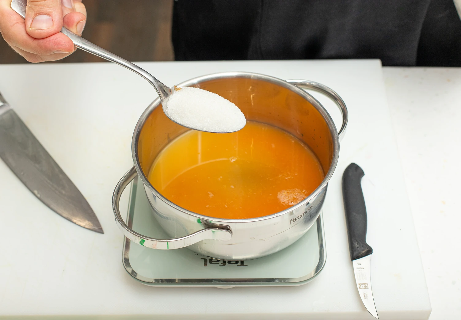 Для соуса смешайте оба вида сахара, апельсиновый и грейпфрутовый соки.