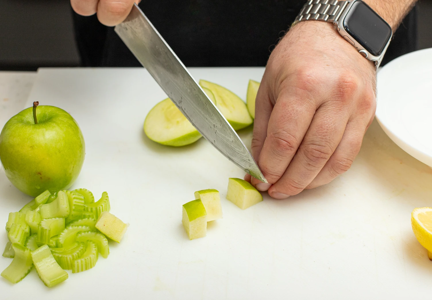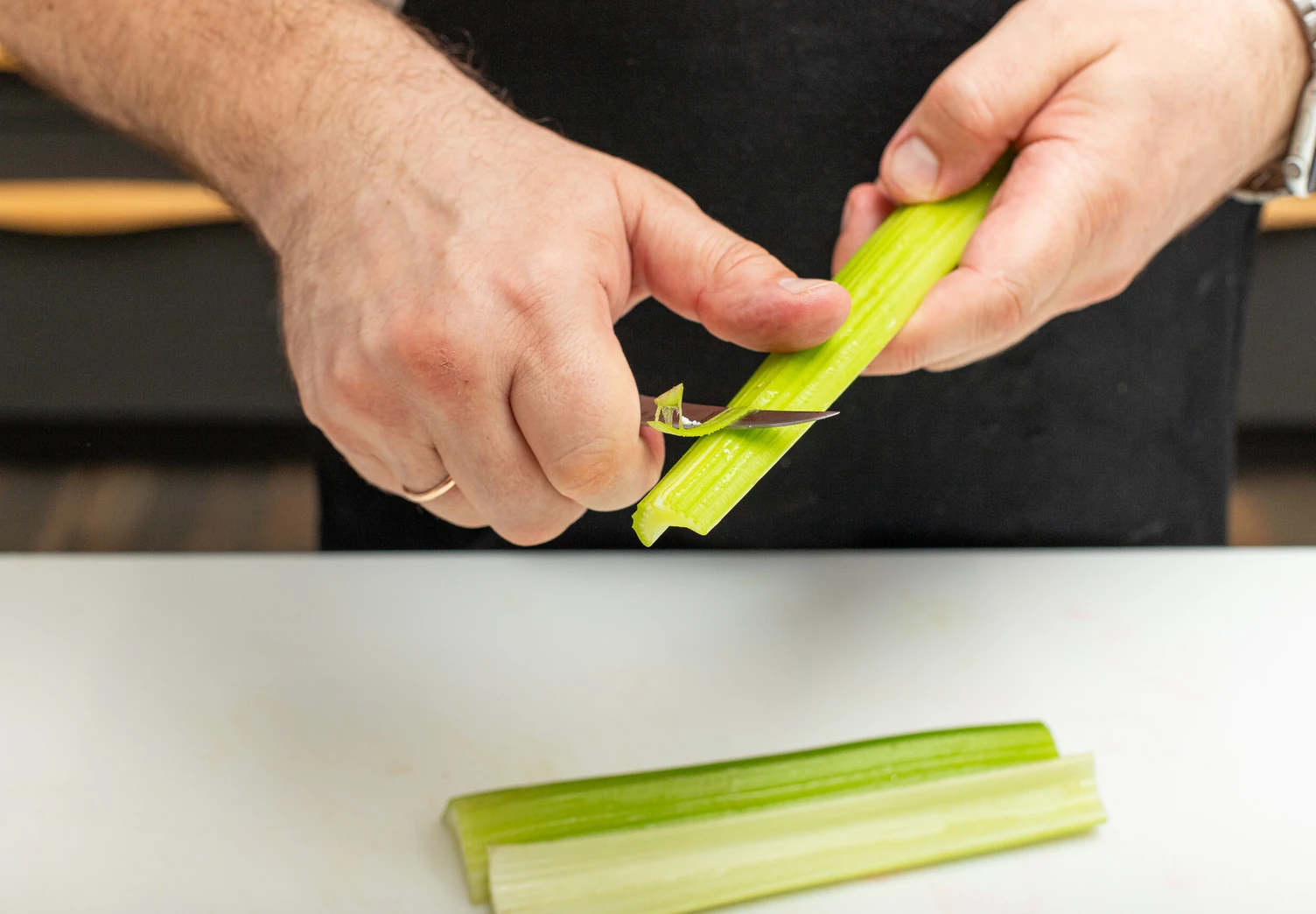 Пока индейка готовится, очистите стебли сельдерея экономкой от жёстких волокон и нарежьте ломтиками по 1-1,5 см.