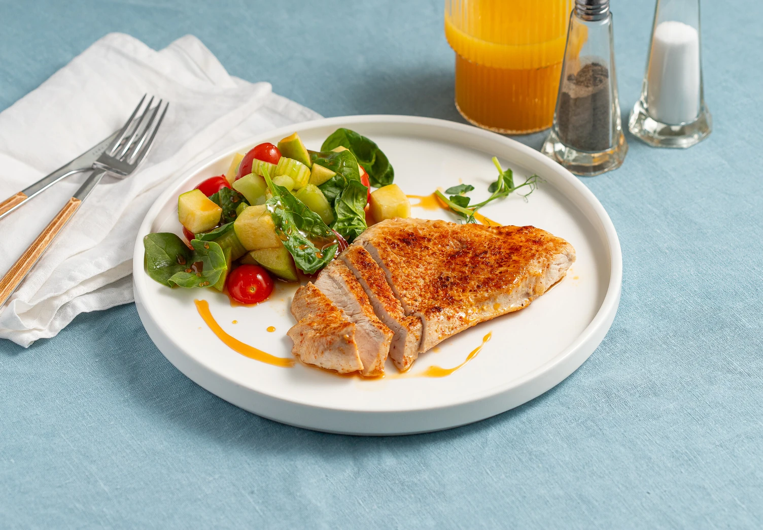 Перед подачей на стол выложите на тарелку салат и стейк из индейки. Полейте блюдо оставшимся соусом.