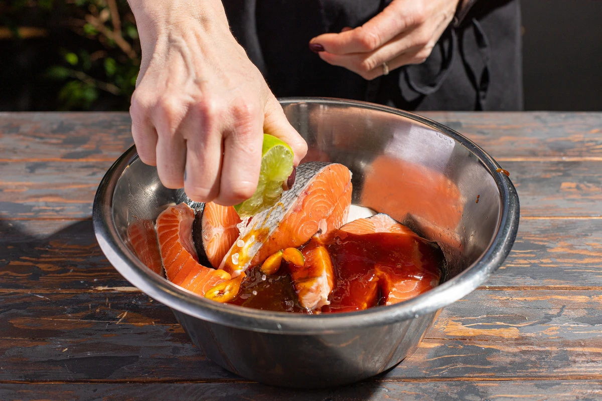 Полейте стейки из сёмги соусом терияки, выдавите сок половинки лайма, посолите, добавьте кусочек острого перца и измельчённую половину кинзы.