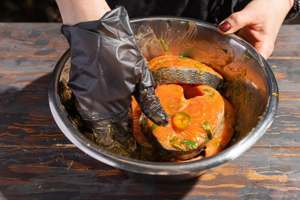 Перемешайте рыбу с маринадом и оставьте на 30 минут при комнатной температуре.