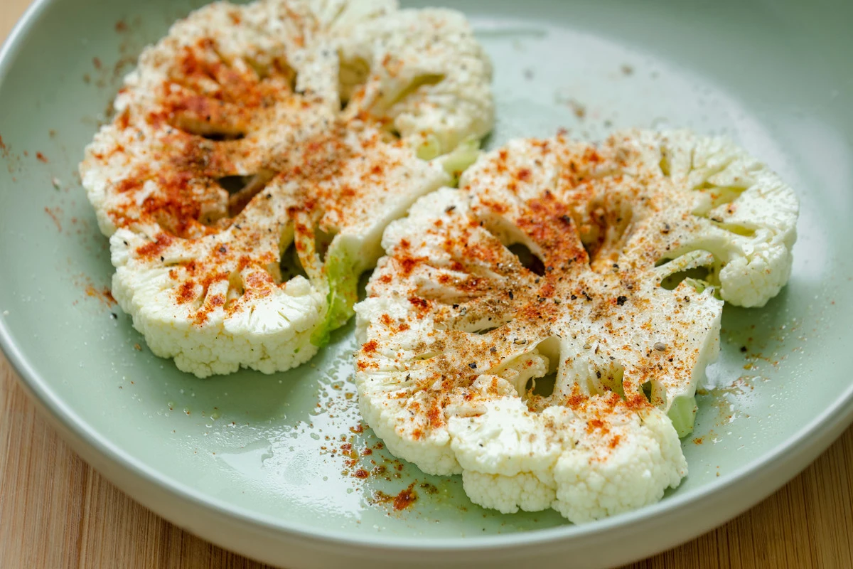 Для стейков из цветной капусты возьмите целый кочан, разрежьте вдоль пополам, затем с каждой стороны отрежьте стейк толщиной примерно 2 см. Оставшуюся капусту можно использовать в других блюдах. Приправьте стейки с обеих сторон оливковым маслом, паприкой, кориандром, солью и перцем.