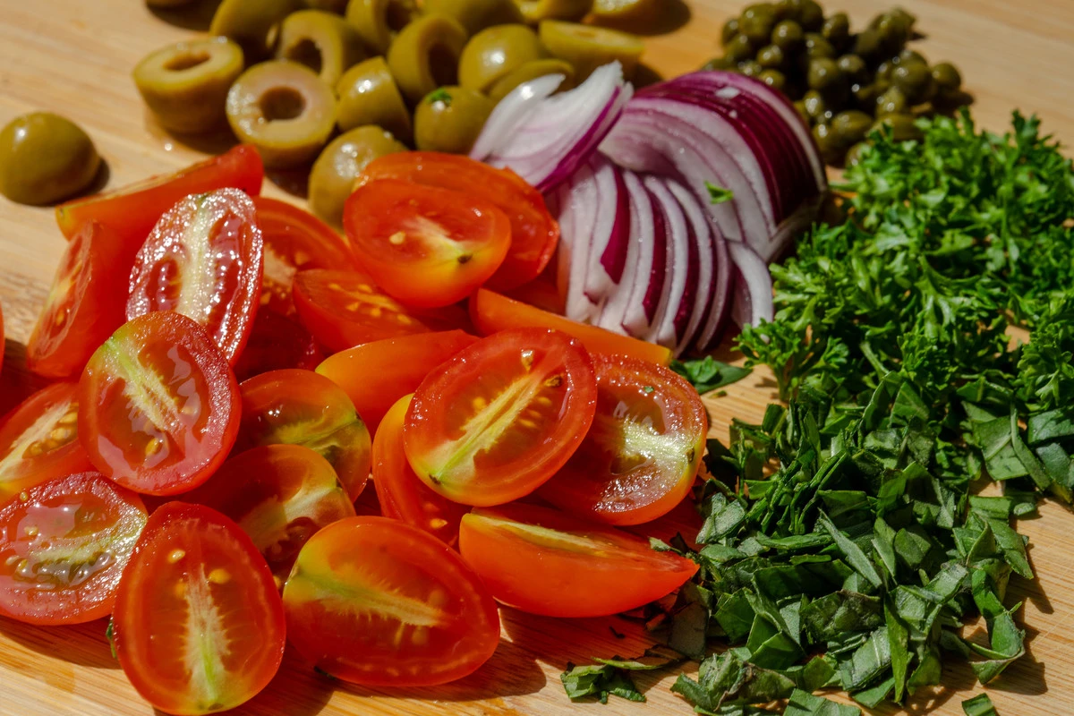 Пока готовится капуста, в отдельной сковороде приготовьте сальсу. Лук, чеснок и зелень мелко нарежьте. Оливки и томаты разрежьте пополам.
