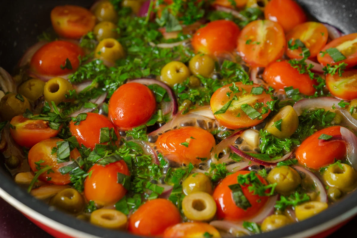 На невысоком огне разогрейте оливковое масло, добавьте лук и чеснок и обжарьте в течение 2-3 минут до мягкости, периодически помешивая. Затем добавьте томаты, оливки, каперсы, зелень, бальзамический уксус и немного воды. Потушите пару минут, помешивая. Приправьте солью и чёрным перцем. Попробуйте, если слишком много кислоты, добавьте щепотку сахара и ещё немного подогрейте.
