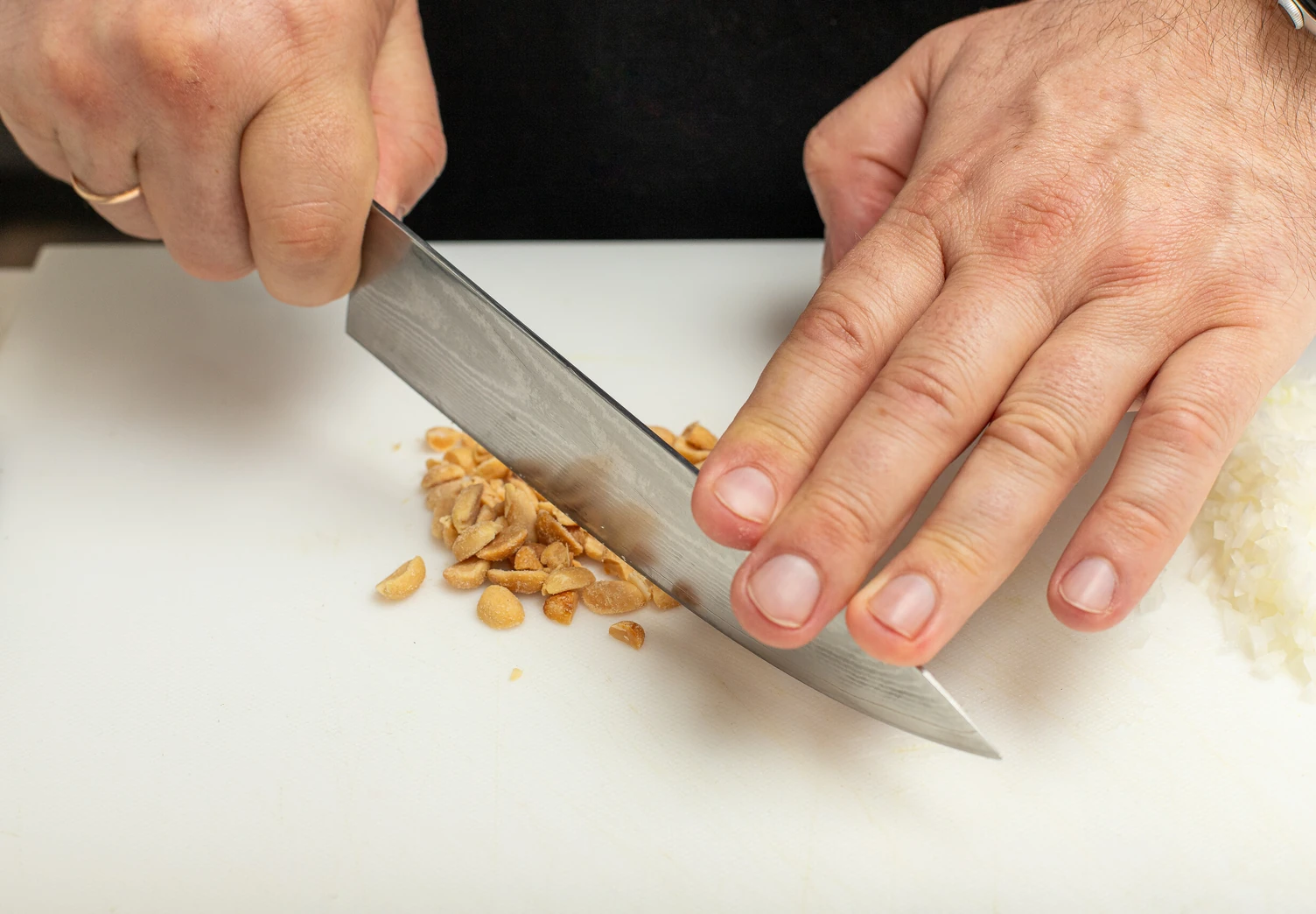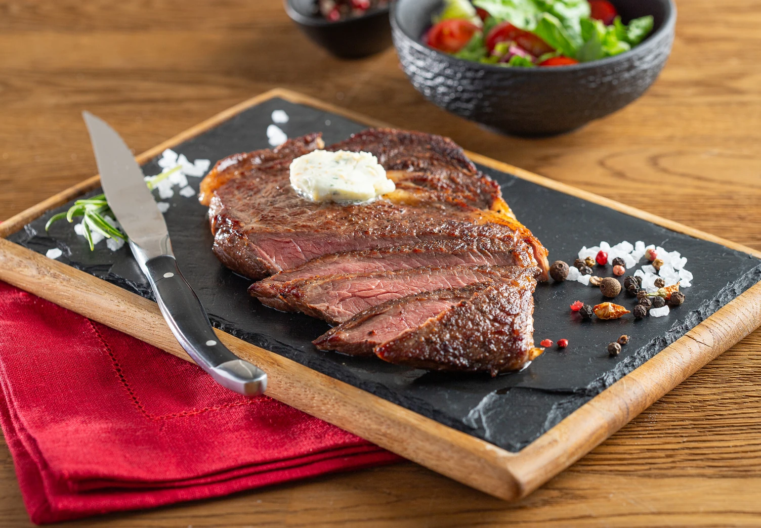 Сочный рибай с пикантным маслом — просто, но эффектно. Масло для этого рецепта можно сделать заранее, оно отлично хранится в холодильнике 3-4 дня. Вместо арахиса можно использовать лук фри — получится не менее вкусно.