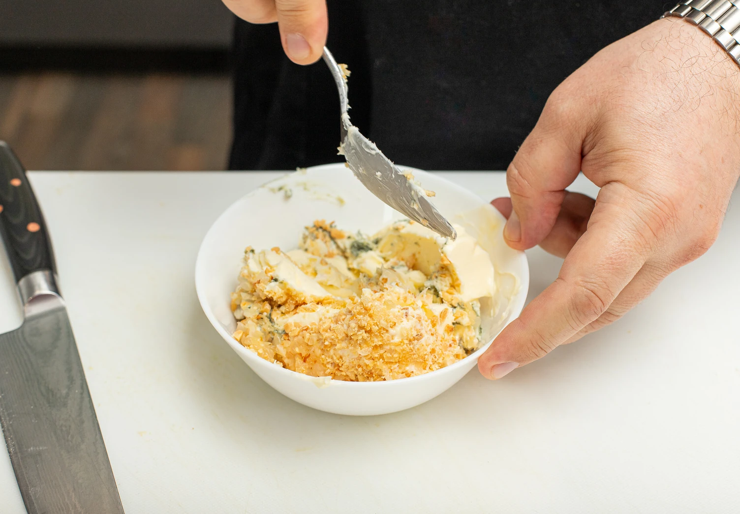Возьмите орехи и добавьте к ним сливочное масло комнатной температуры (важно, чтобы оно не было слишком тёплым), а также горгонзолу. Тщательно перемешайте всё вилкой до однородности.