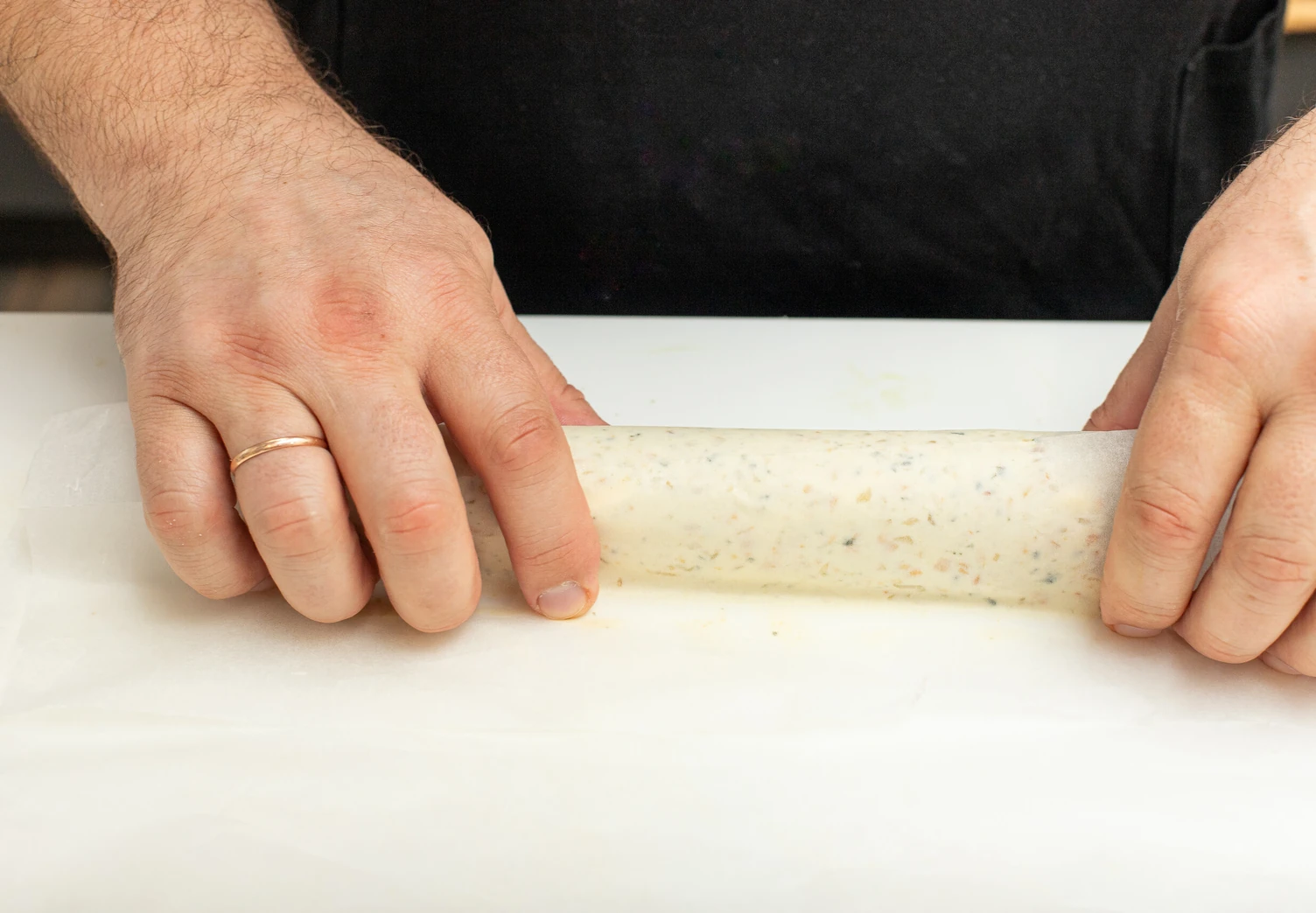 Затем выложите получившуюся массу на пищевую плёнку и скрутите в форме батончика диаметром примерно 5 см. Уберите в холодильник хотя бы на полчаса.