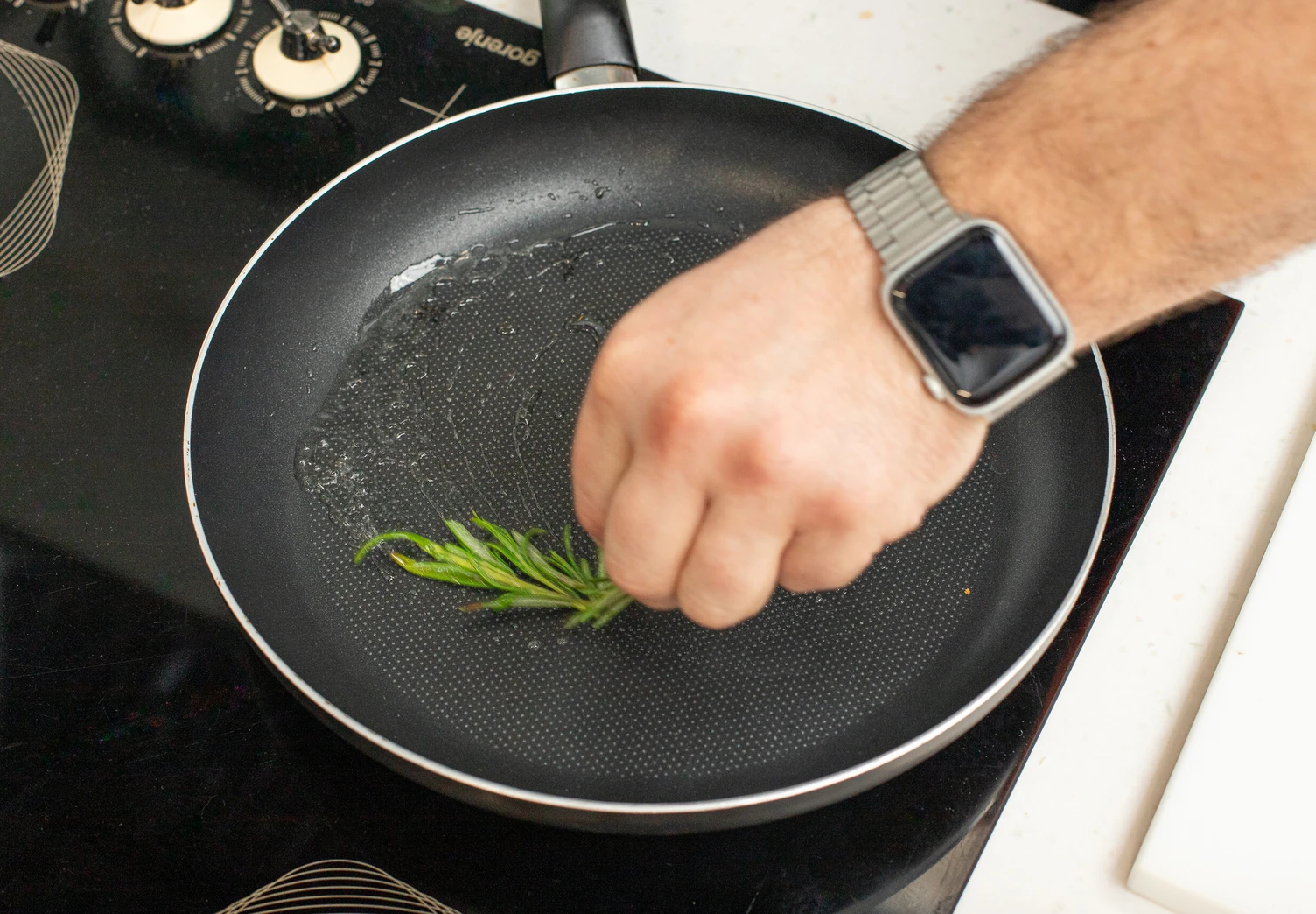 Разогрейте сковороду с растительным маслом и обжарьте на ней в течение минуты слегка раздавленные зубчики чеснока и веточку розмарина.