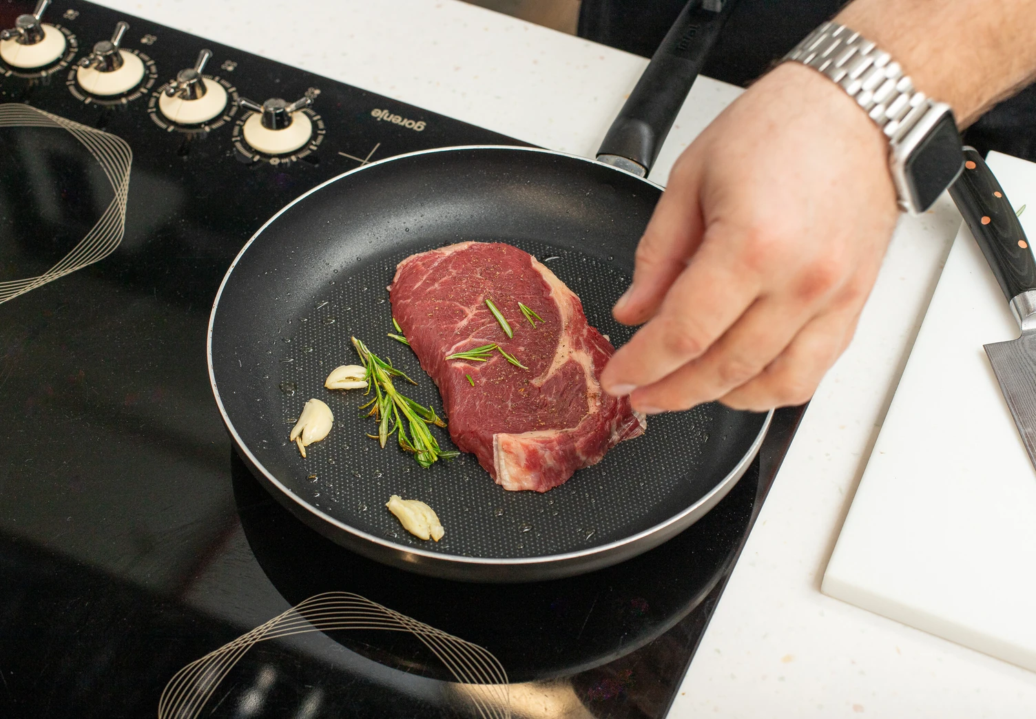 Выложите стейк и обжаривайте по 2–3 минуты с каждой стороны для средней прожарки (medium).