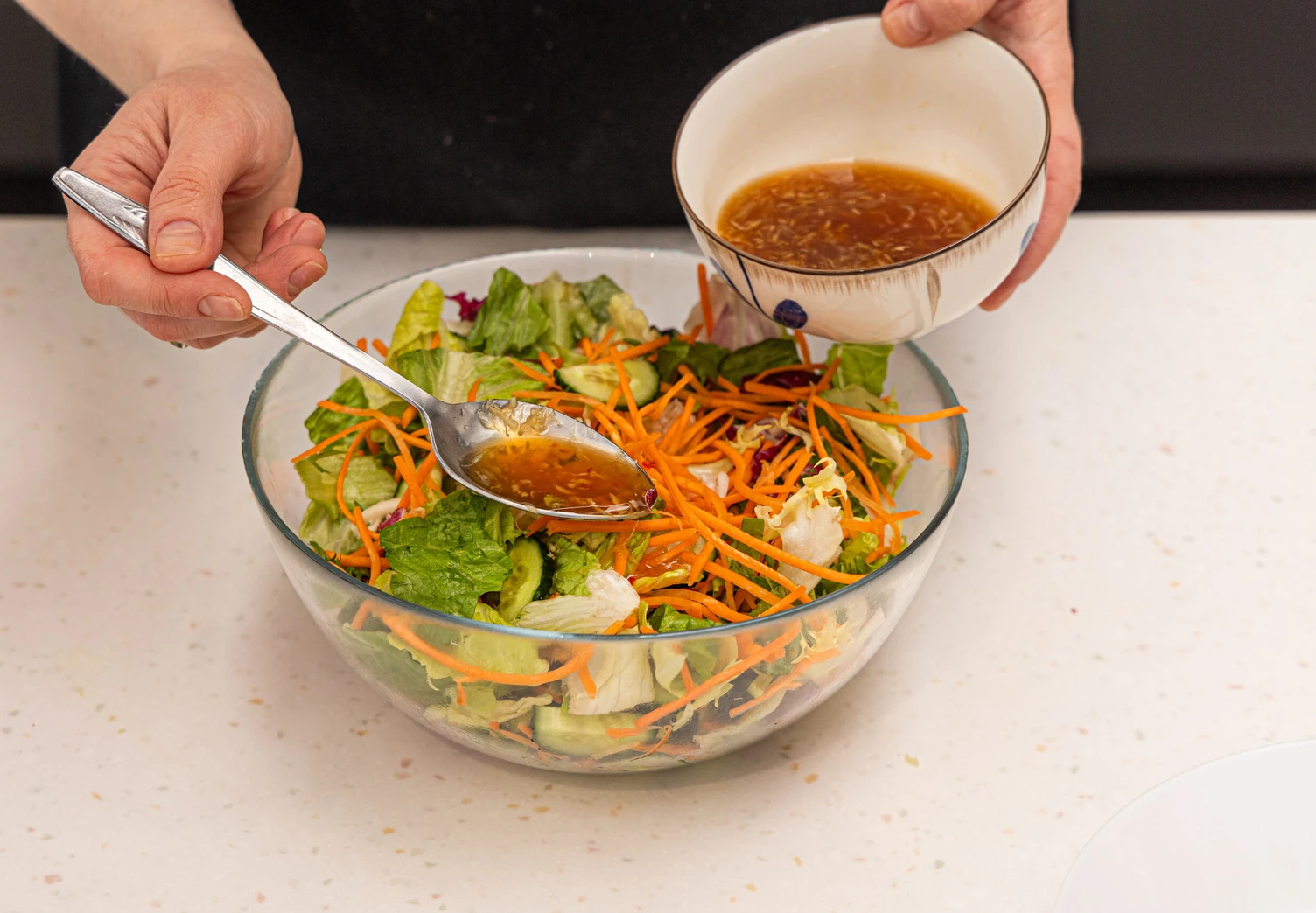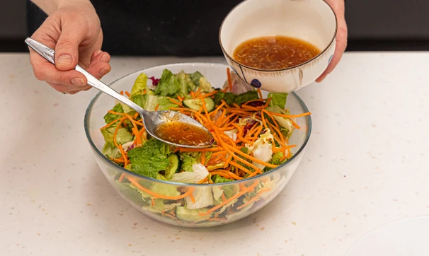 В большой миске смешайте салатный микс, морковь, огурцы и половину заправки.