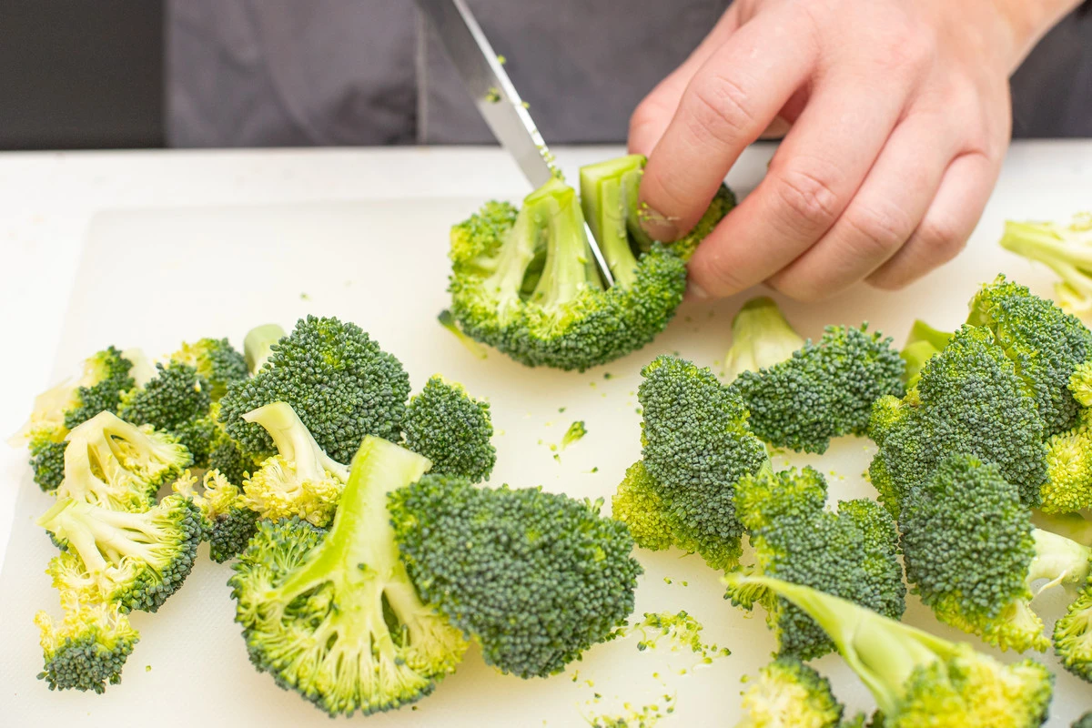 Брокколи помойте, разберите на соцветия, слишком крупные можно разрезать на несколько частей. Кочерыжки не понадобятся.