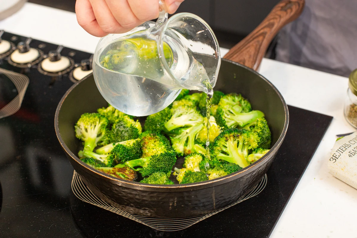 Разогрейте сковороду с 2 ст. ложками растительного масла и выложите брокколи. Готовьте 10-15 минут на среднем огне, помешивая при необходимости. Можете добавить немного воды.