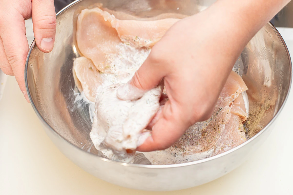 Куриное филе положите в миску, налейте туда сливки, насыпьте специи, перемешайте. Оставьте на 30 минут при комнатной температуре.