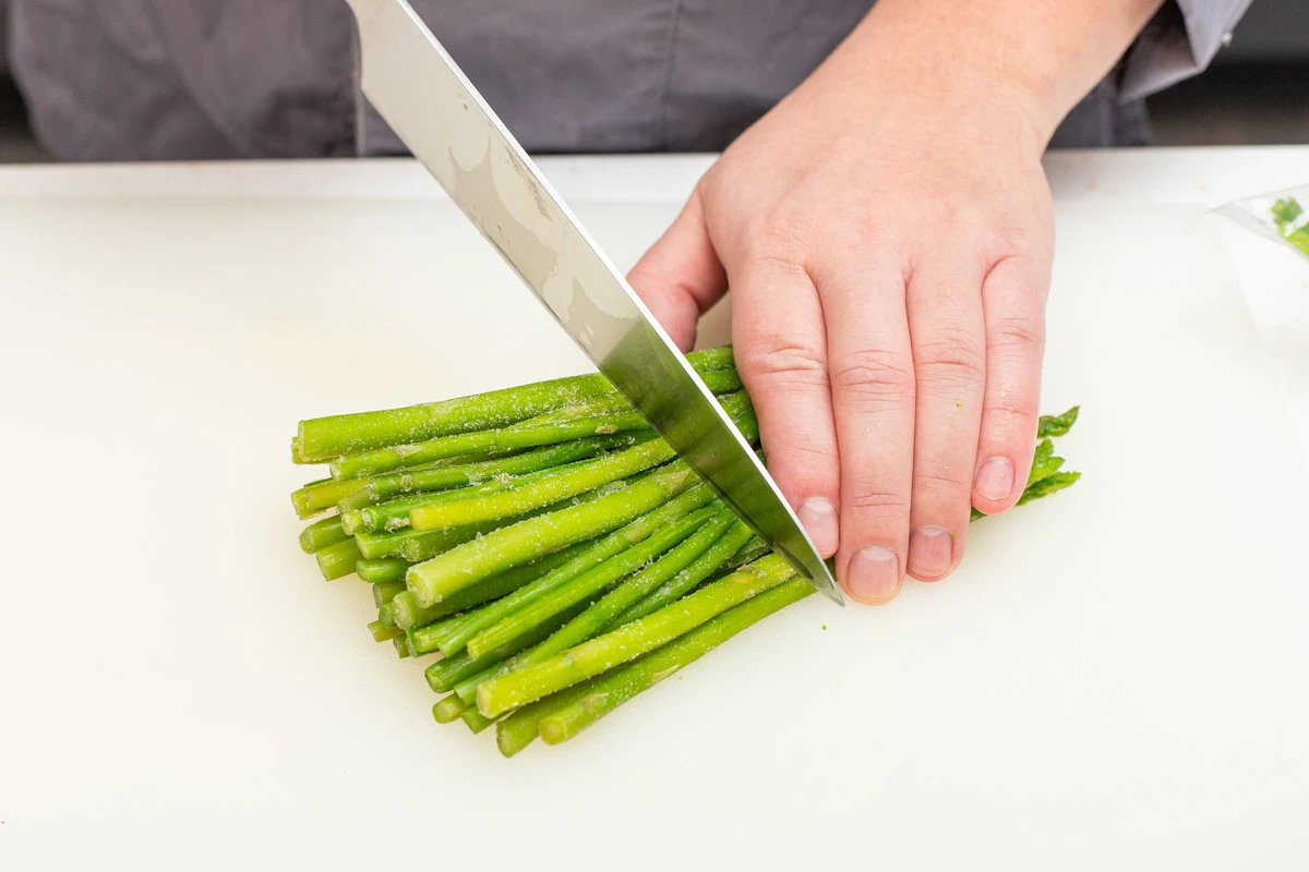 Спаржу разрежьте пополам (размораживать её не нужно).
