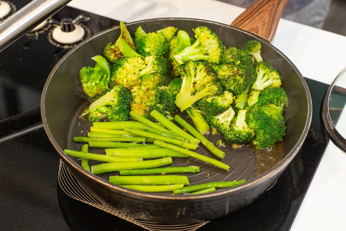 Через 10-15 минут после начала приготовления брокколи сдвиньте соцветия на одну сторону сковороды и выложите спаржу. Готовьте ещё примерно 5 минут на средне-сильном огне, помешивая при необходимости.