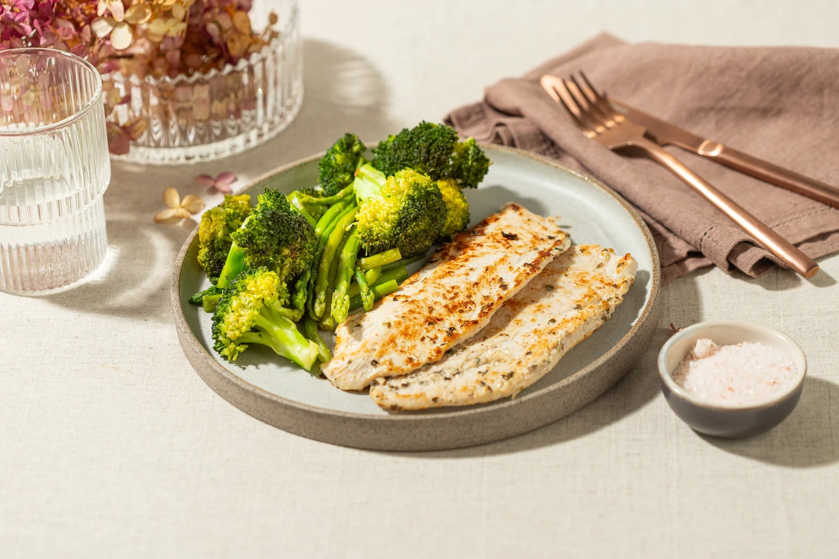 Такие стейки из курицы получаются очень нежными и сочными. Готовятся они быстро, и в сочетании с брокколи и спаржей превращаются во вкусный и полезный обед или ужин.