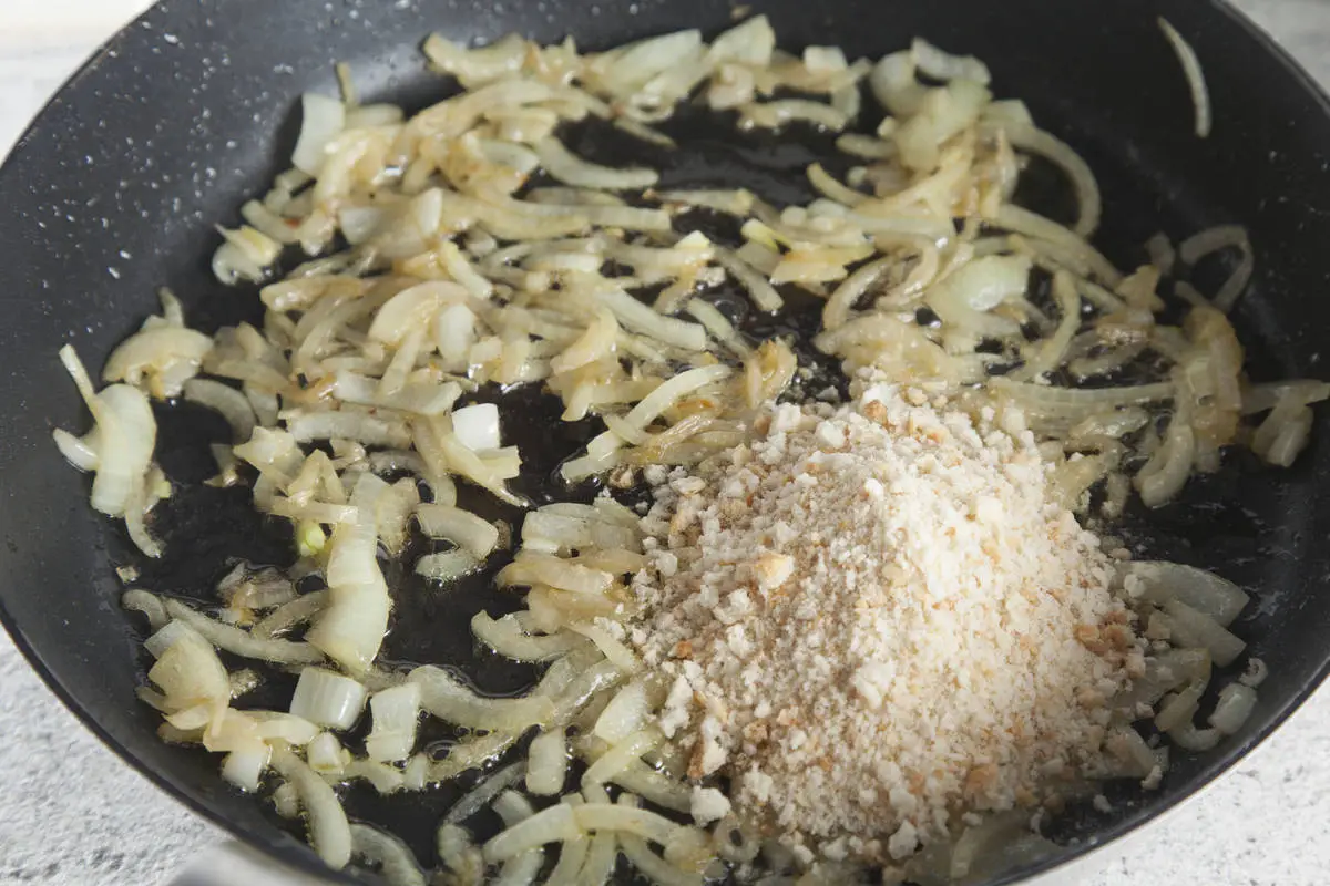 Сухарики измельчите в крошку в блендере или ступке. Лук порежьте полукольцами и обжарьте до золотистости, всыпьте сухарную крошку и перемешайте, посолите по вкусу.