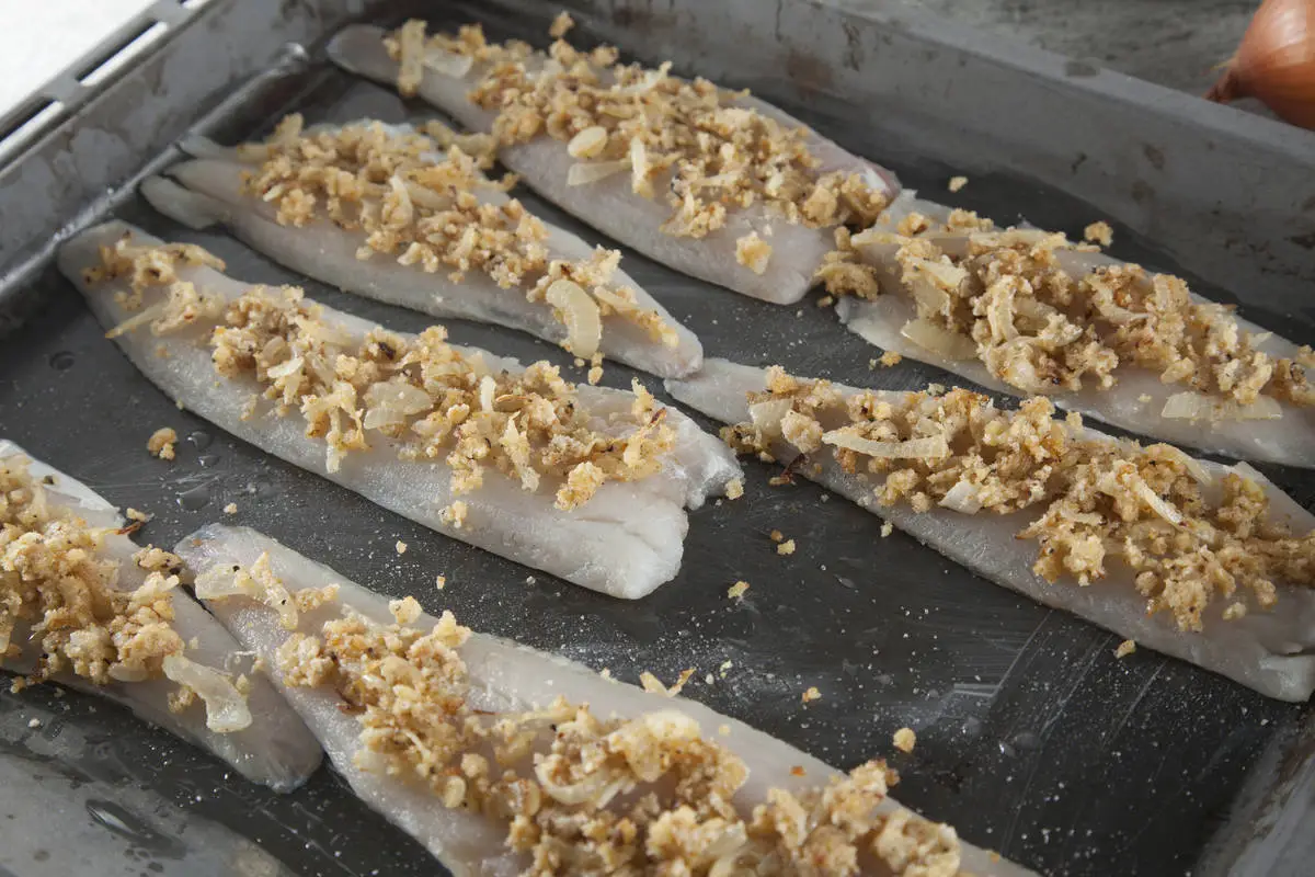 Судак с луковой крошкой и соусом с хреном