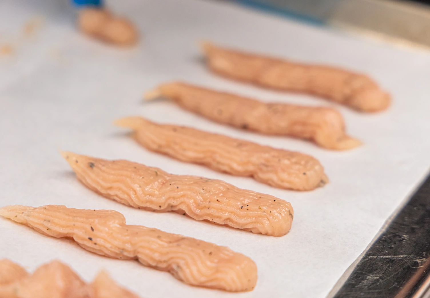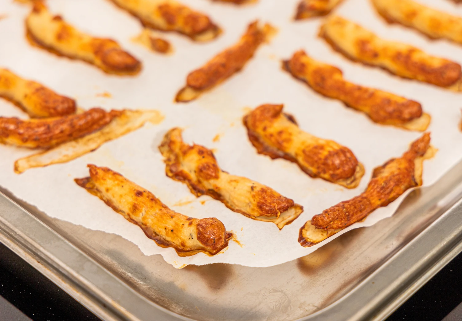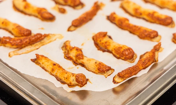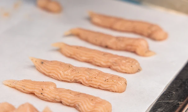 Переложите массу в кондитерский мешок и выдавите тоненькими колбасками на противень, застеленный пергаментом.