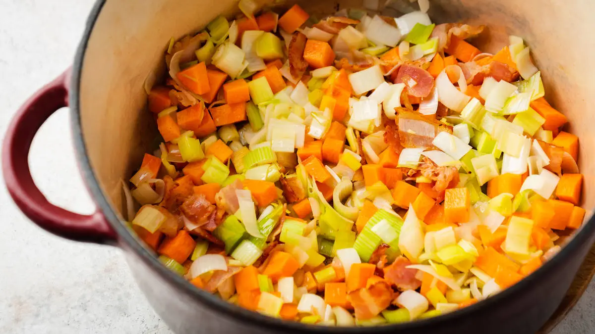 Для приготовления супа лучше использовать глубокую кастрюлю с толстым дном или сотейник. Бекон мелко нарежьте, обжарьте на топлёном масле на среднем огне до подрумянивания. Нарежьте морковь кубиками, лук-порей — мелко, чеснок раздавите ножом и слегка измельчите. Добавьте овощи к бекону и обжаривайте на среднем огне до мягкости около 10 минут.