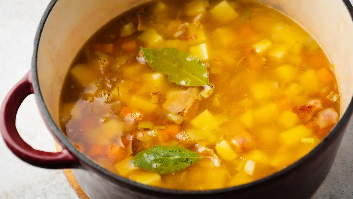 Картофель очистите и нарежьте кубиками. Добавьте картофель в кастрюлю, перемешайте и обжарьте пару минут. Добавьте готовый бульон (примерно 1,3 литра, остальной оставьте), лавровый лист, соль и чёрный перец. Солите осторожно, так как бекон уже солёный и копчёная рыба тоже. Лучше в конце досолить по вкусу. Доведите до кипения и варите на среднем огне около 10 минут до мягкости картофеля.