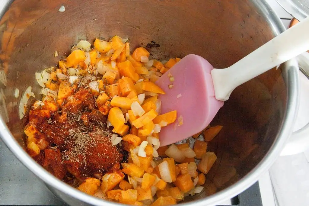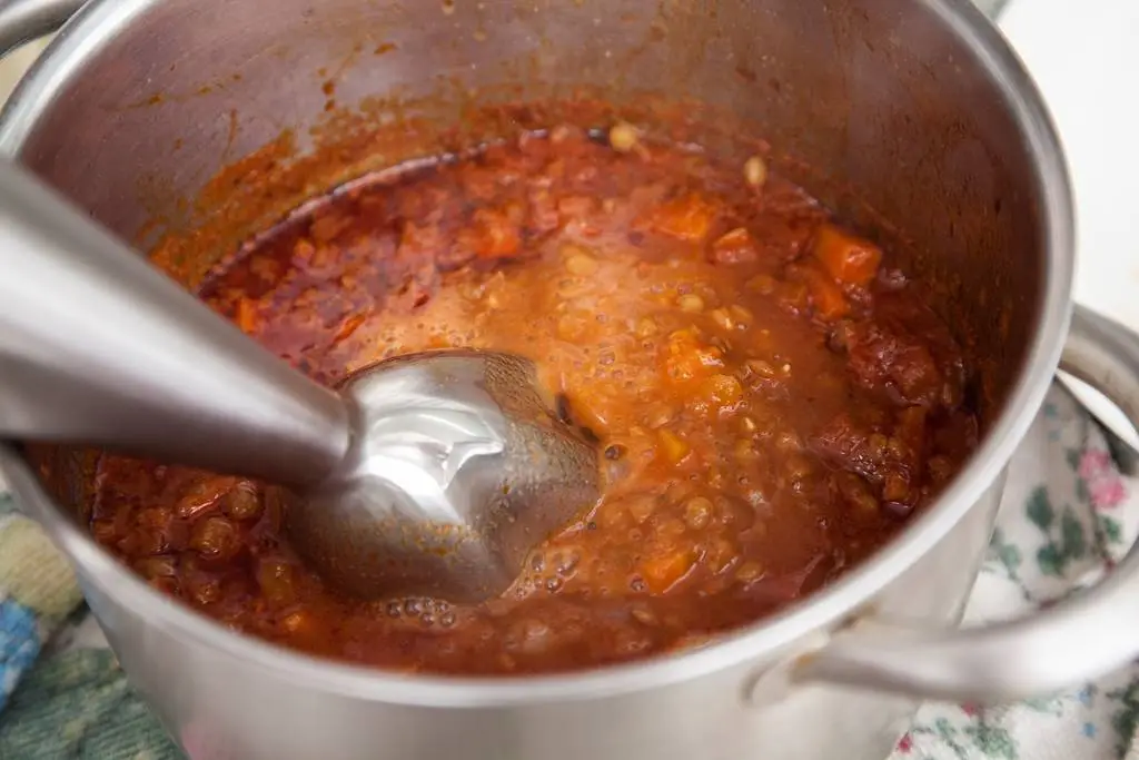 В кастрюле разогрейте масло, обжарьте овощи до золотистости, всыпьте специи, перемешайте, всыпьте промытую чечевицу и залейте водой и томатом, варите до готовности чечевицы. Отложите часть чечевицы.