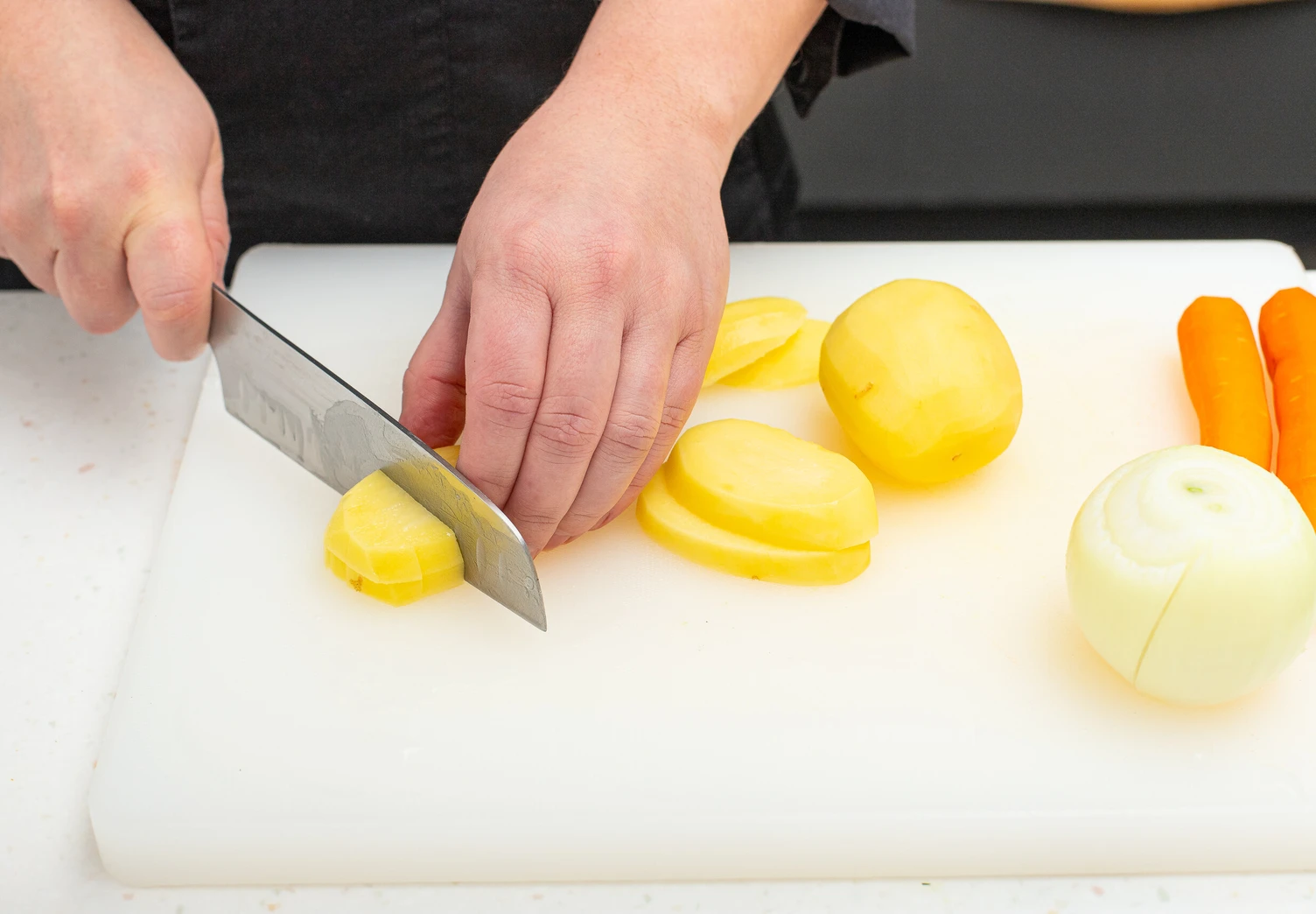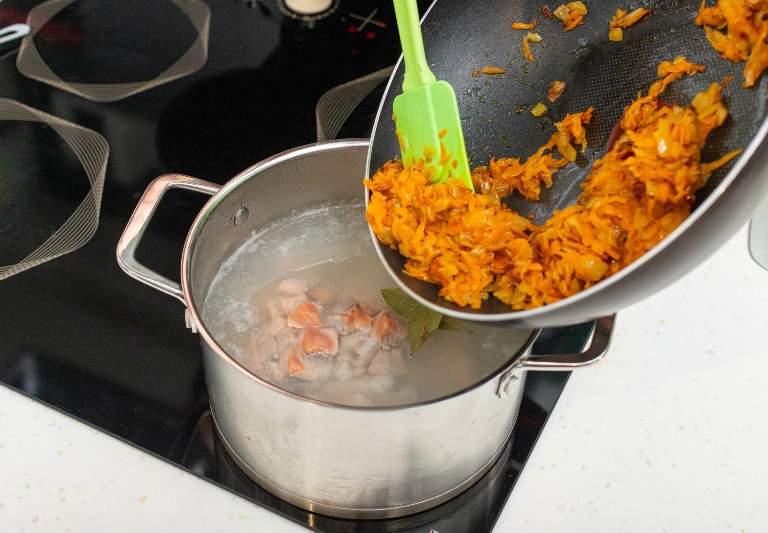 Нарежьте рыбу кубиком и выложите вместе с морепродуктами к картофелю с пассерованными овощами.