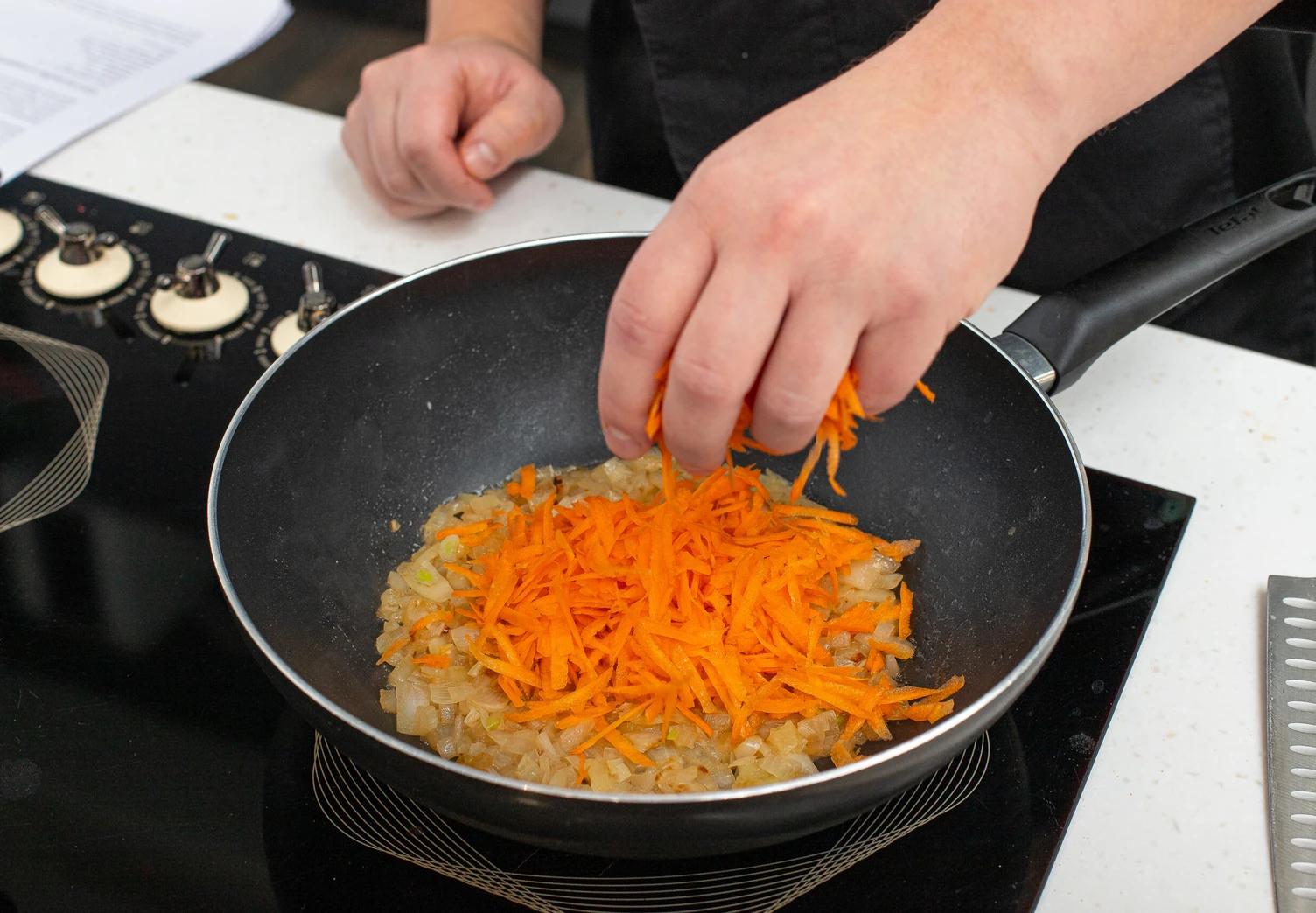 Нарежьте мелким кубиком репчатый лук и натрите морковь на крупной тёрке. Пассеруйте овощи на смеси растительного и сливочного масла.