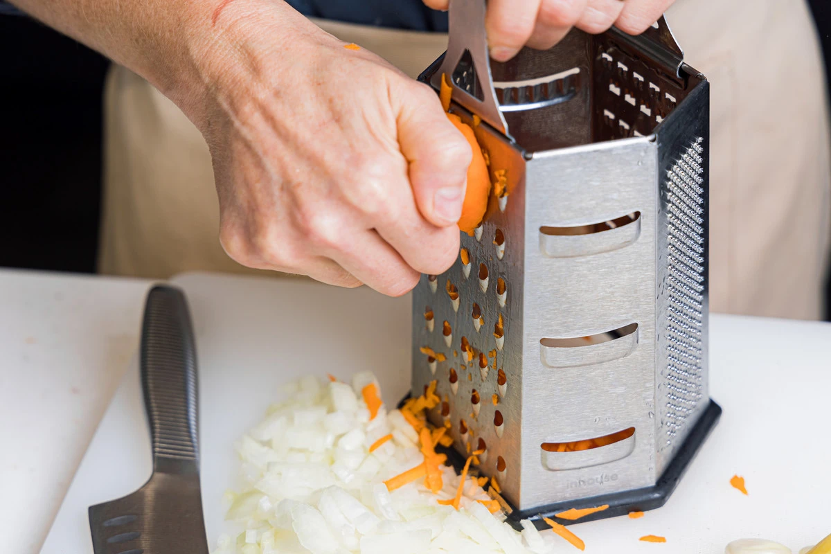 Лук почистите и мелко нарежьте. Морковь почистите и измельчите на крупной тёрке. Чеснок почистите и мелко нарежьте.