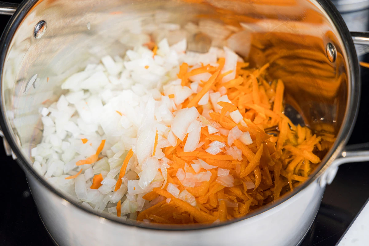 В кастрюлю налейте растительное масло, положите подготовленные лук, морковь и чеснок. Готовьте, периодически помешивая, на среднем огне до золотистого цвета.