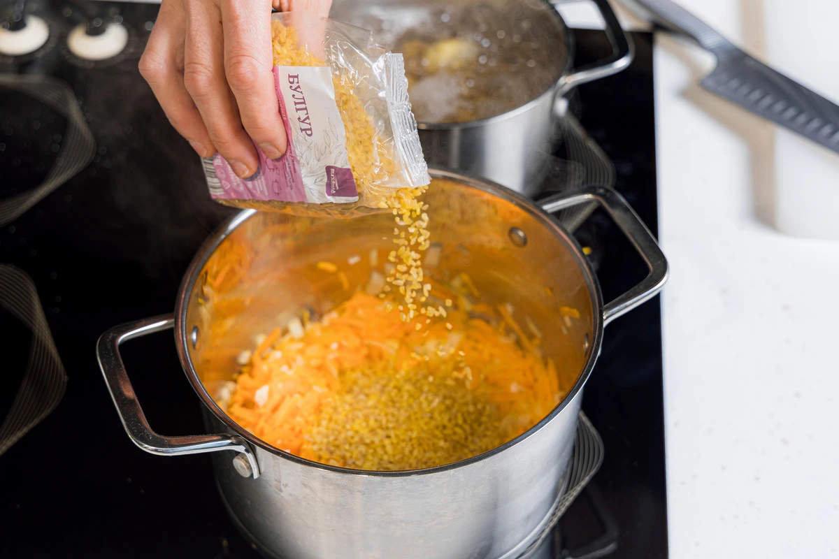 Затем добавьте к овощам булгур (промывать не надо), всыпьте сухой бульон и налейте воду. Доведите до кипения и продолжайте варить на среднем огне.