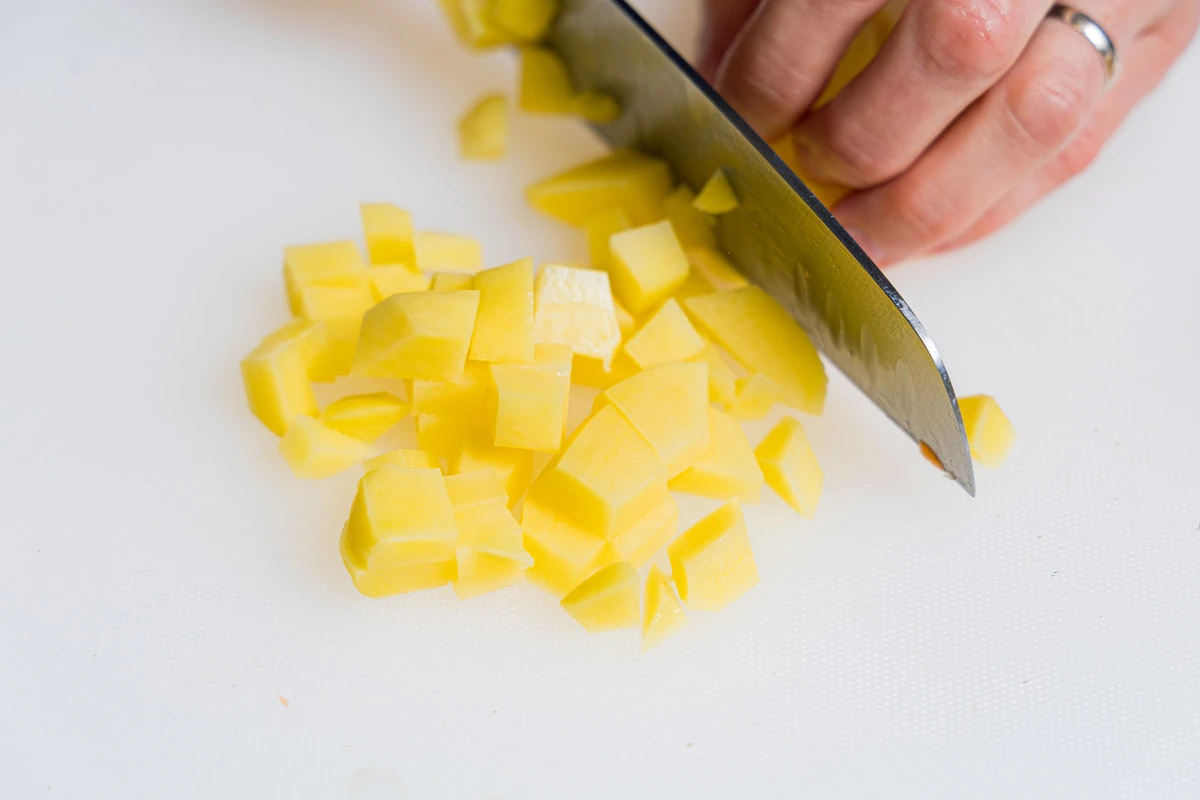 Картофель почистите и нарежьте кубиками, добавьте в суп.