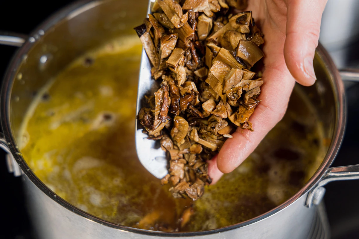 С грибов слейте воду. Аккуратно вылейте её в суп, но не до конца: если вдруг в грибах был мелкий мусор, чтобы он остался в мисочке/ковшике.