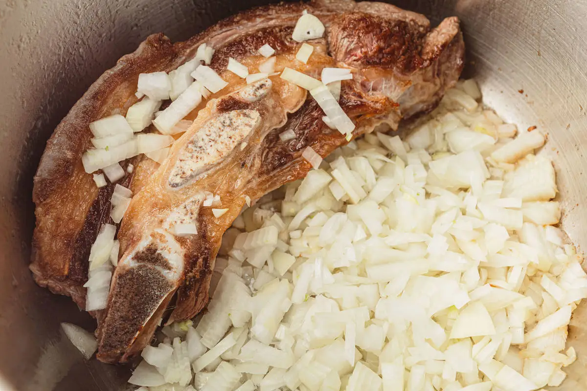 Лук очистите и нарежьте кубиками. Говядину обжарьте на растительном масле прямо в кастрюле. Добавьте лук и спассеруйте до прозрачности.