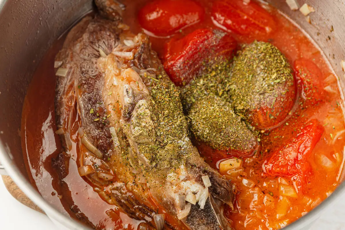 Добавьте всё содержимое банки с томатами (сами томаты предварительно разомните вилкой), соль и специи. Если есть хмели-сунели, непременно тоже положите. Влейте 3-3,5 литра воды, доведите до кипения и варите 40-45 минут.