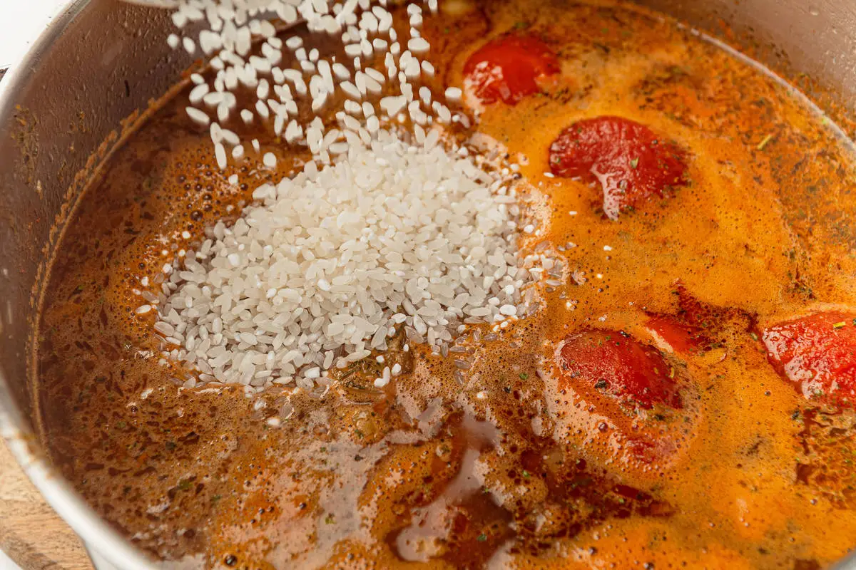 Рис всыпьте в суп, добавьте ткемали и варите до готовности риса (около 20 минут).