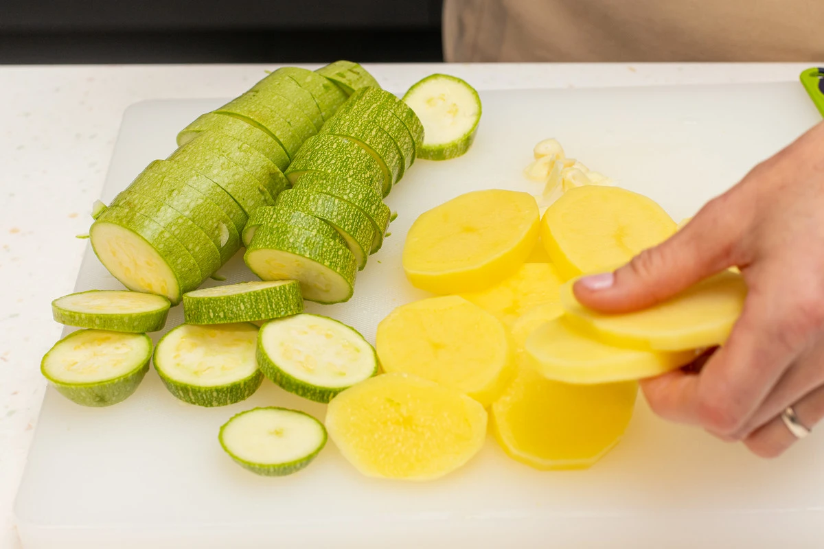 Кабачки помойте, отрежьте плодоножки и нарежьте кружочками. Картофель помойте и почистите, нарежьте брусочками. Чеснок почистите и нарежьте крупно. Кстати, для этого рецепта можно взять кабачки и картофель в соотношении 2:1.
