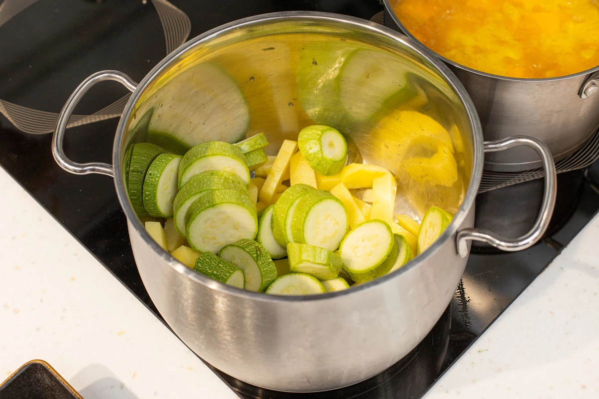 Разогрейте кастрюлю с 1 ст. ложкой растительного масла, выложите в неё кабачки, картофель и чеснок. Готовьте 5 минут на среднем огне, периодически помешивая.