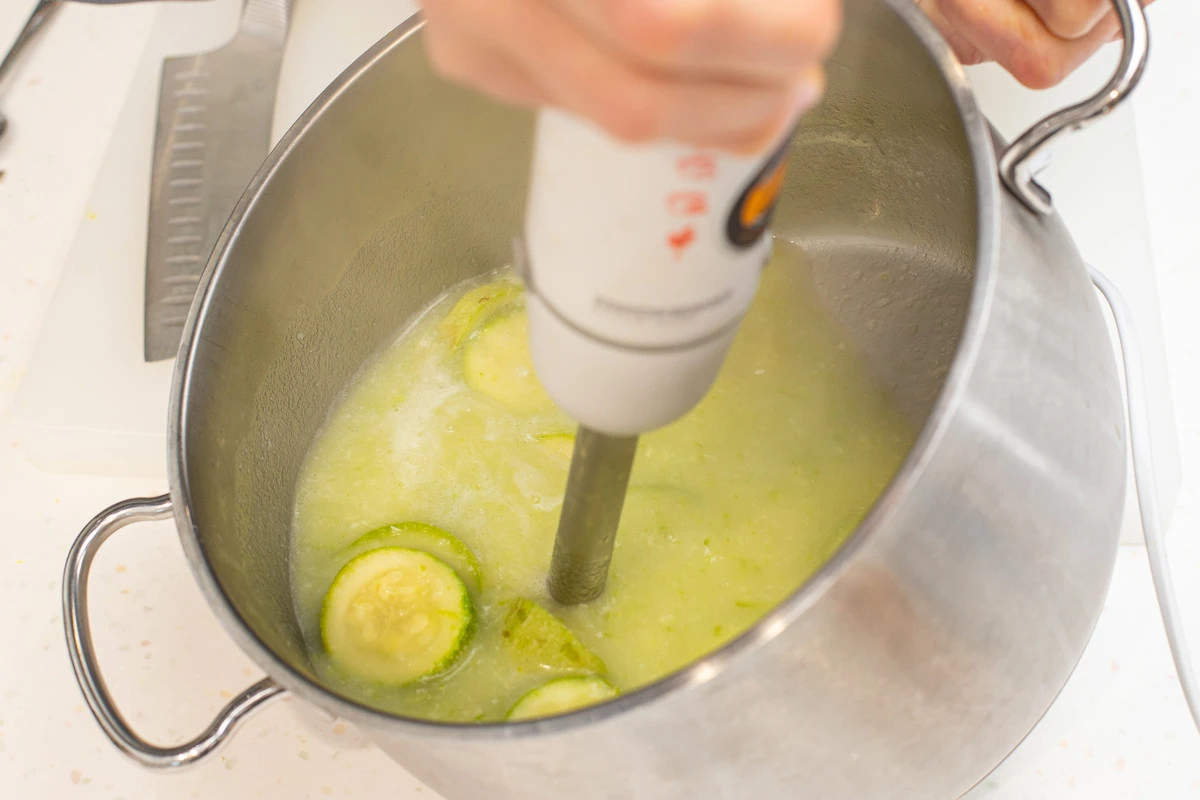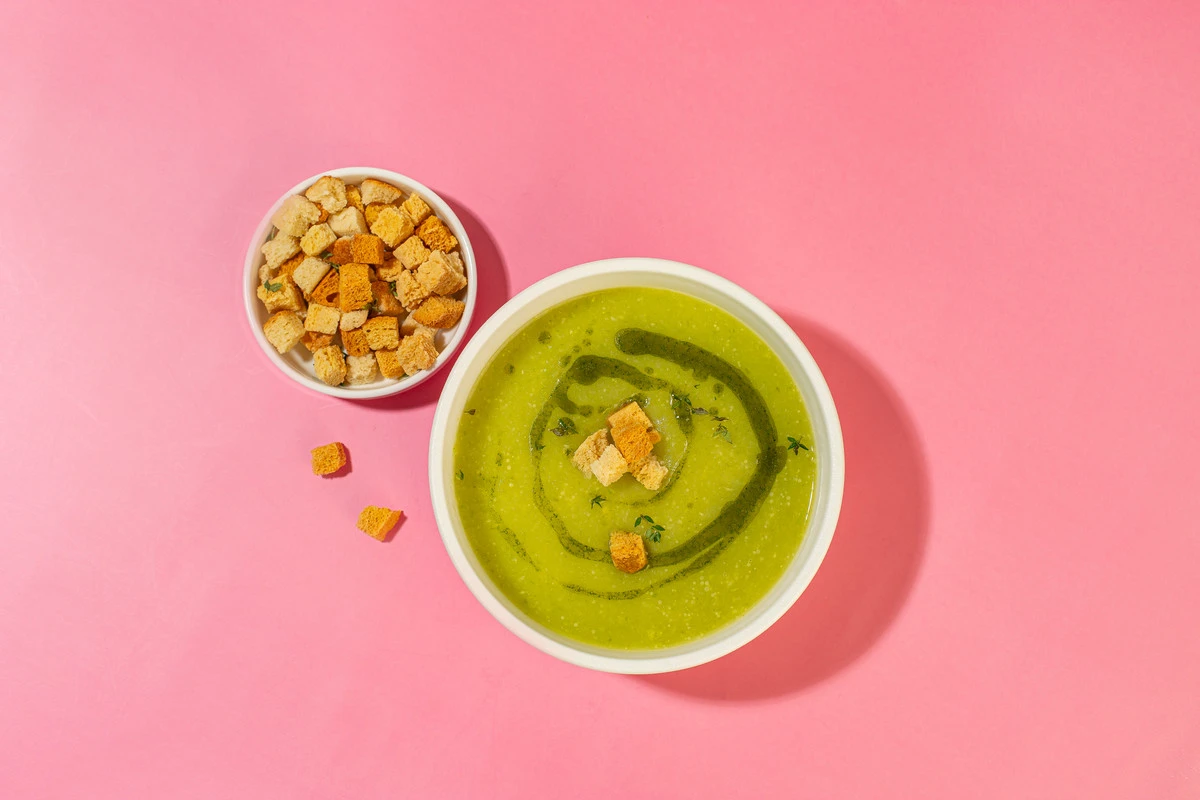 Ещё один простой рецепт супа-пюре в вашу копилку. Основные ингредиенты в нём — кабачки и картофель, при этом зелёное масло с базиликом добавляет оригинальности и вкуса.