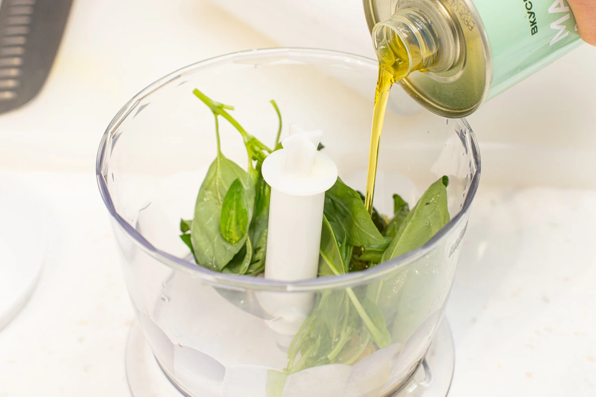 Листья базилика помойте, обсушите и выложите в чашу блендера. Налейте оливковое масло и измельчите до однородности. Процедите получившийся соус через сито, чтобы получилось зелёное масло. Чтобы цвет масла был более насыщенным, можно добавить к базилику немного любой нейтральной по вкусу зелени — например, петрушку, шпинат.