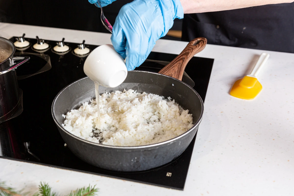 Залейте его рисовым уксусом с растворённым сахаром, тщательно перемешайте и остудите до комнатной температуры.